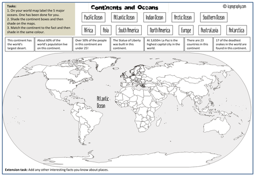 Includes a beautiful embedded video from youtube with images of the world from space. Oceans and Continents- worksheet. Challenge your Year 7 8 and 9 students with our Geography worksheets or encourage GCSE pupils to enhance their understanding of key units with teacher-made revision aids.